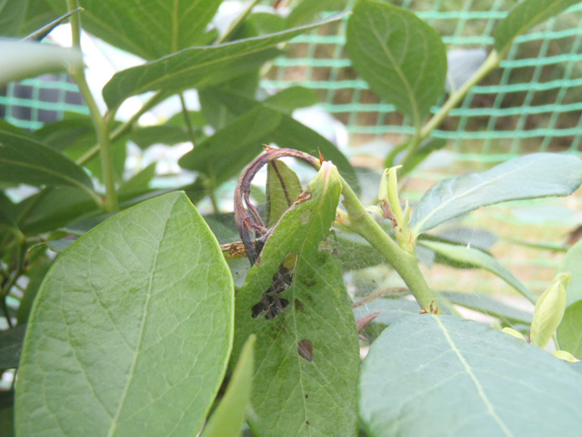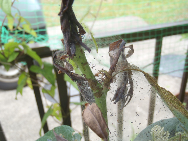 この時期になると、いつも新芽の先端が枯れて黒焦げになった様な状態になり、その場所にクモの巣が張ります。