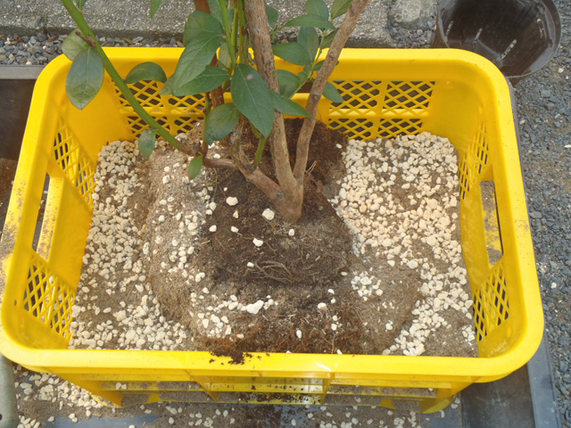 今回は土を半分ほど落とし、鹿沼3、輸入ピート1、竹チップ1の割合で混ぜた用土を入れた。