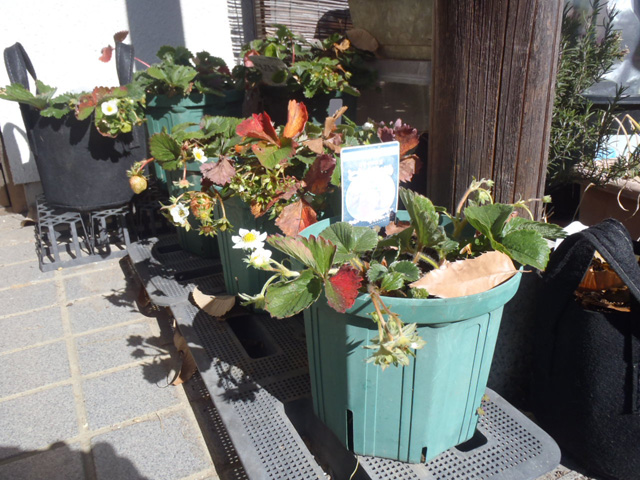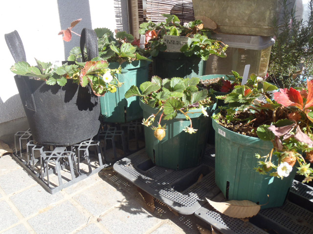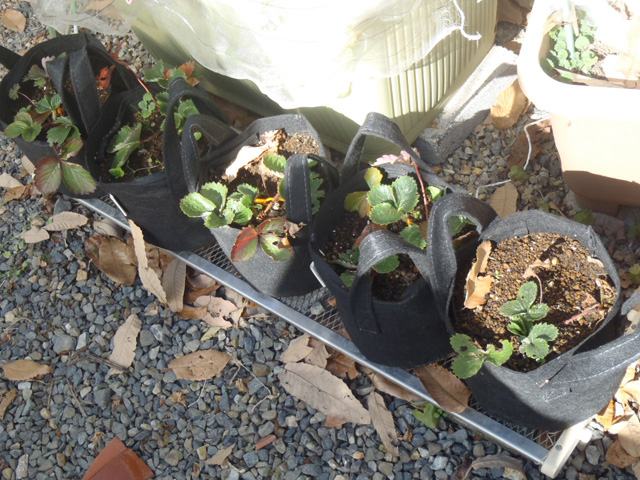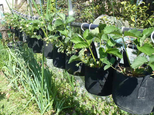| イチゴ狩り用に不織布ポットを10個ぶら下げてます |