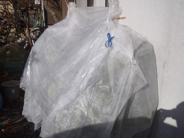 | 寒風除けにビニールを下した状態。天気の良い昼間はこの状態で多少なりとも光合成ができればと。 |