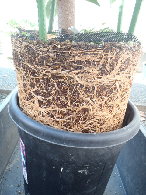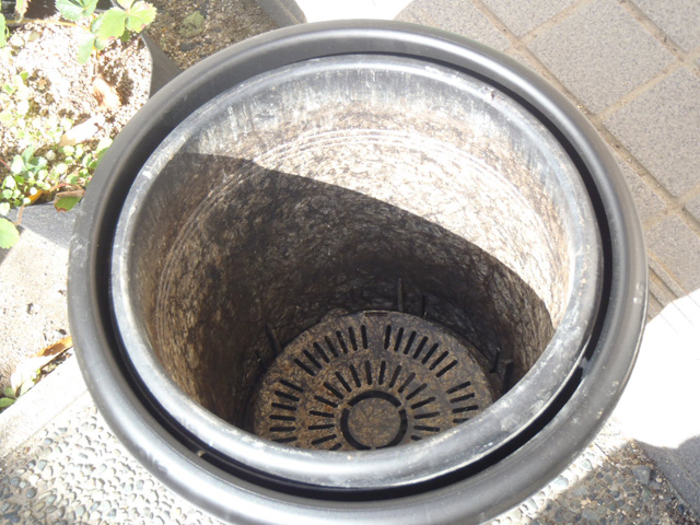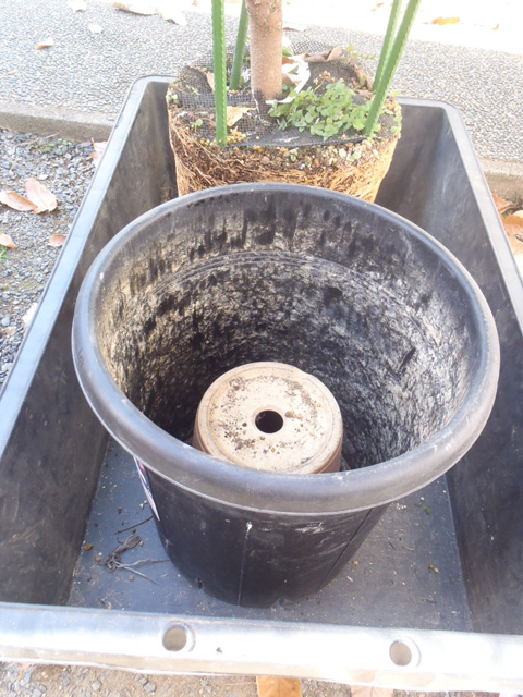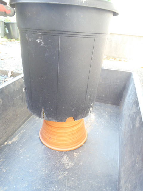 この鉢は「果樹用」のため鉢替前提に作られ、底板が固定されてなく持ち上がる作りになっている。
