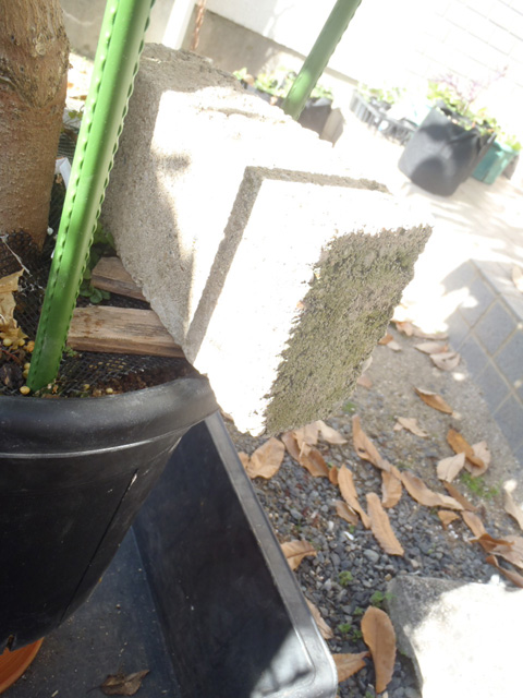 よって、ひとまわり小さい陶器の鉢の上に乗せて上部側面をコンクリートレンガで叩きまくったら、なんとか抜けた。