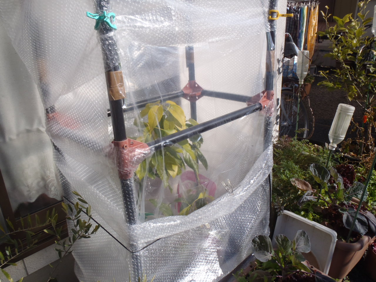 おいらが休みの時には温室の緩衝材を開けて気温の上昇をおさえているけど、平日はできないから。