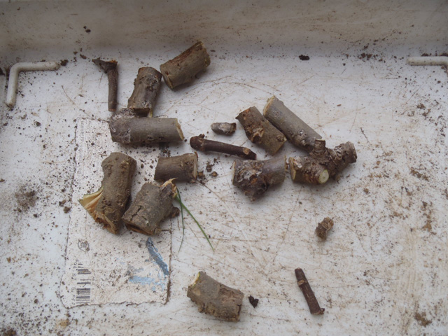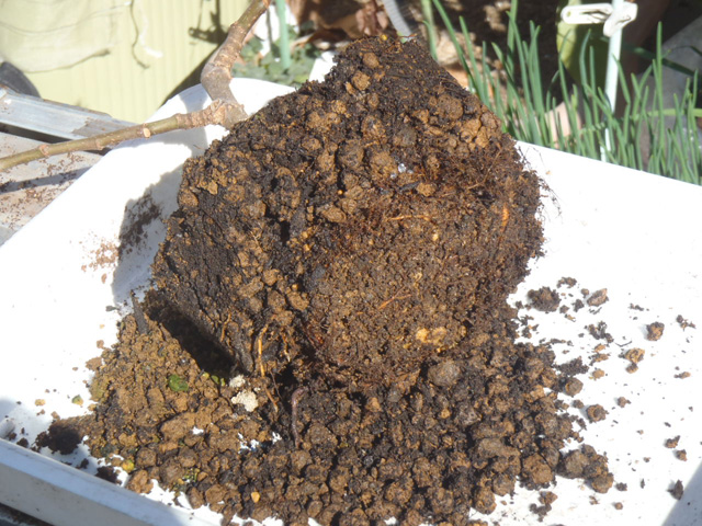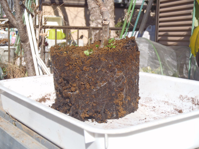 底(底面)を10pほど切り落とし周りは熊手で引っ掻いて根をほぐし、だいたい3〜5p程度の土を落としました。