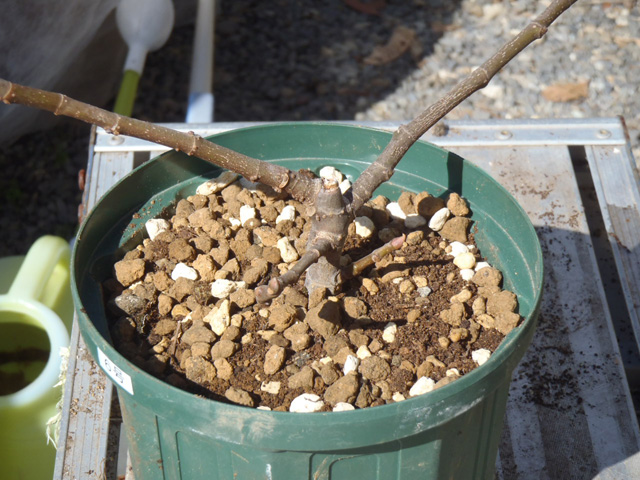 D抜いたイチジクを鉢に戻し、土を入れる。(上面がウオータースペースのギリになるようにする)
