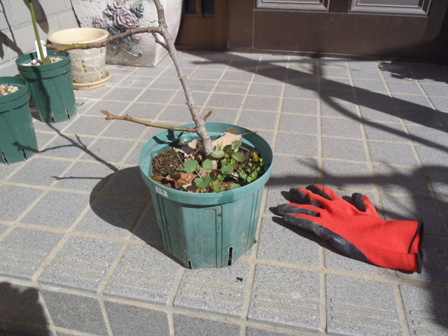挿し木で育てた「8号スリットのドーフィン」は鉢底石を少し入た10号(グロウコンテナ24型)に。