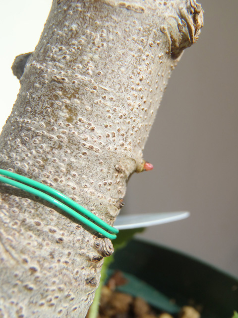 たまたま左右に枝がのびていたので、ひもで枝が地面と平行になるように誘因してみました。