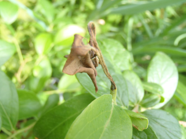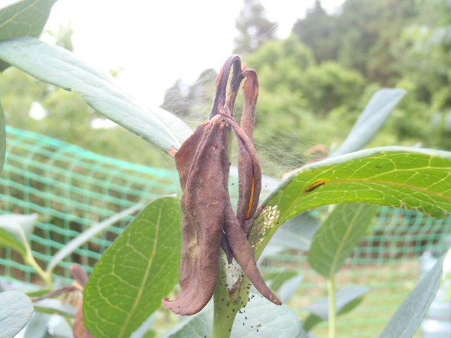 雨による加湿で枯れそこにクモが巣を張るのか、シャシャンボツバメスガが原因なのかは判りません。