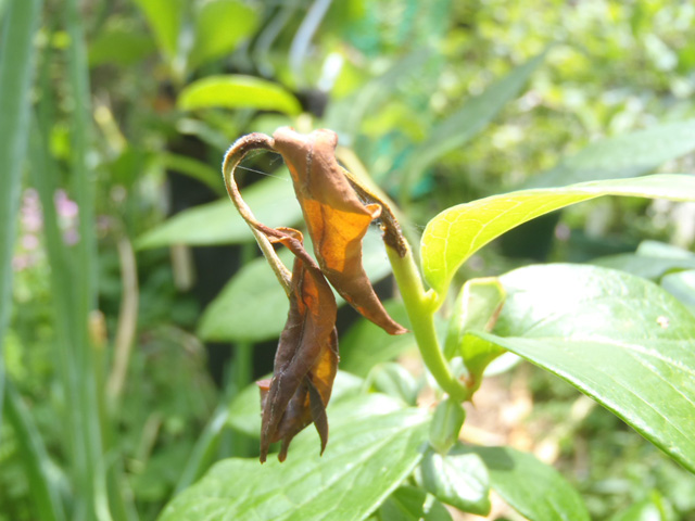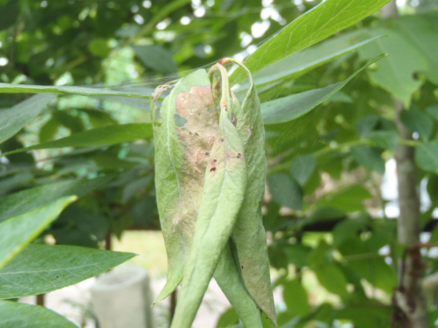 この時期になると、いつも新芽の先端が枯れて黒焦げになった様な状態になり、その場所にクモの巣が張ります。