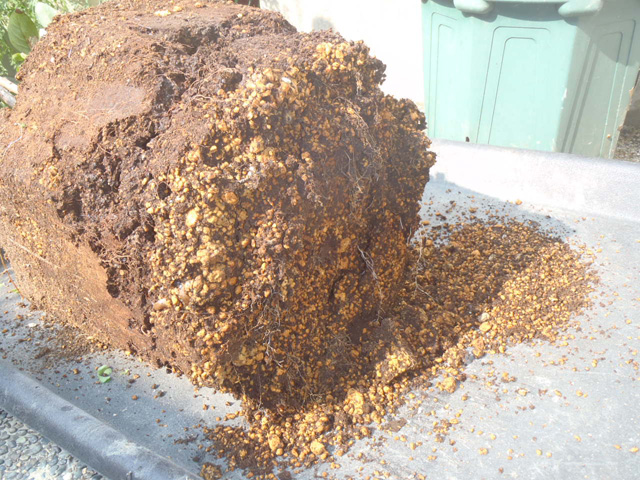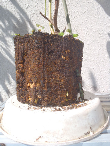 鉢から抜いて気が付いたが、そもそも根がぜんぜん回って無く鉢の中がスッカスカ状態。
