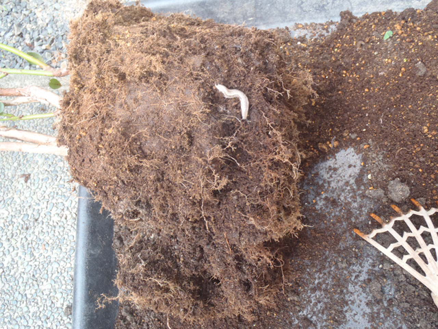 根鉢がぜんぜん出来て無し、コガネムシの幼虫が4匹出てくるし。