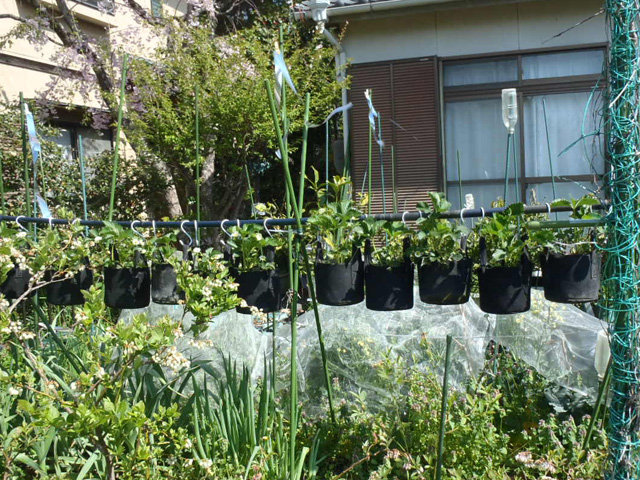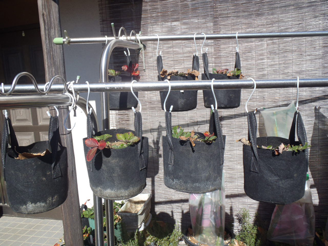| イチゴ狩り用に不織布ポットを10個ぶら下げてます |