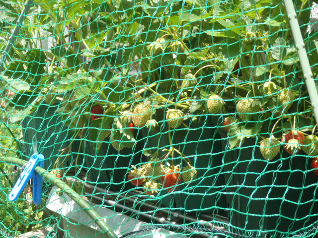 熟して真っ赤っ赤になったイチゴを2日連続で鳥に横取りされて、カミサンにえらく怒られました。