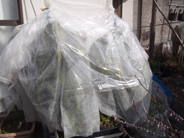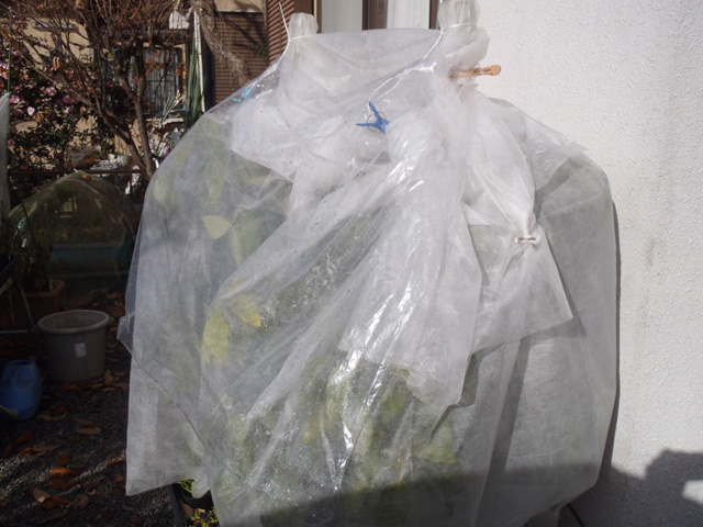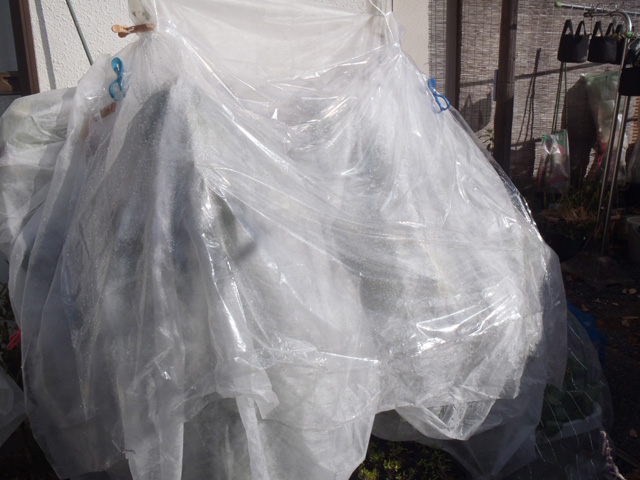 | 寒風除けにビニールを下した状態。天気の良い昼間はこの状態で多少なりとも光合成ができればと。 |