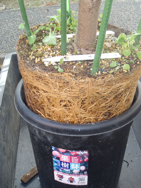 鉢はアップルウェアーの果樹鉢310型を使っています。