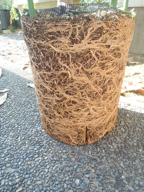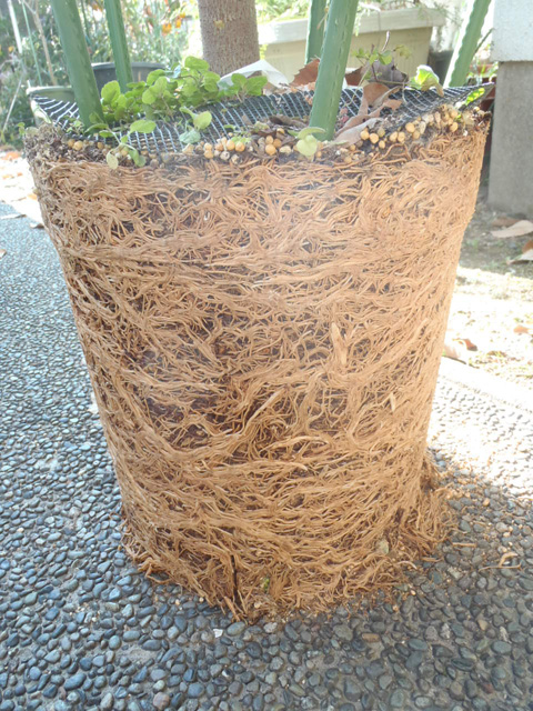 この鉢は「果樹用」のため鉢替前提に作られ、底板が固定されてなく持ち上がる作りになっている。