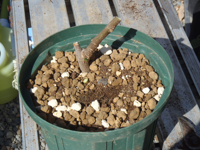 挿し木で育てた「8号スリットのドーフィン」は鉢底石を少し入た10号(グロウコンテナ24型)に。