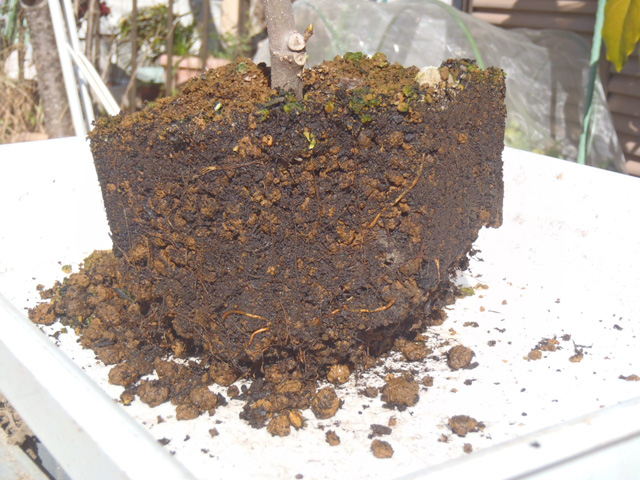 底(底面)を10pほど切り落とし周りは熊手で引っ掻いて根をほぐし、だいたい3〜5p程度の土を落としました。